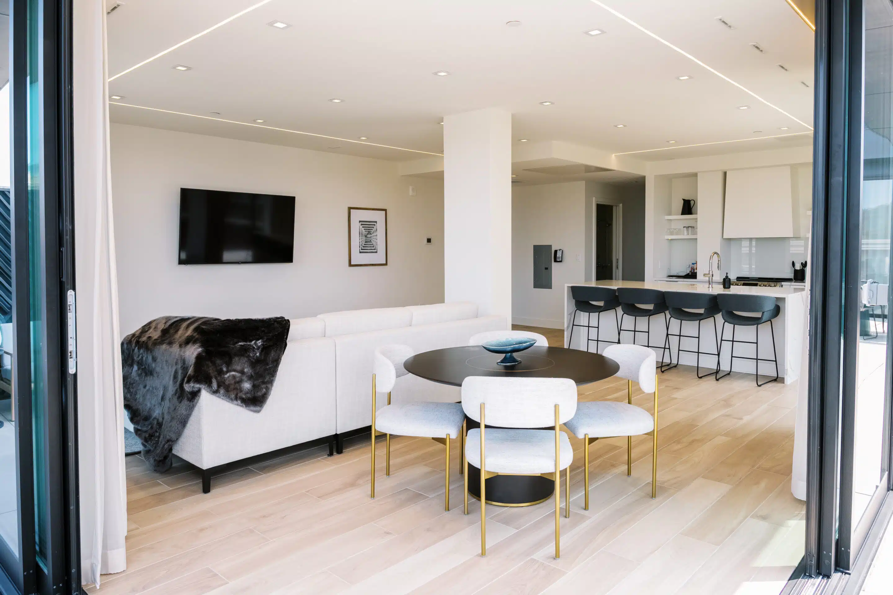 Located on the top floor penthouse level, the Luxury Skyline Suite features an outdoor terrace suite with views of the Downtown Cincinnati Skyline and full kitchen.