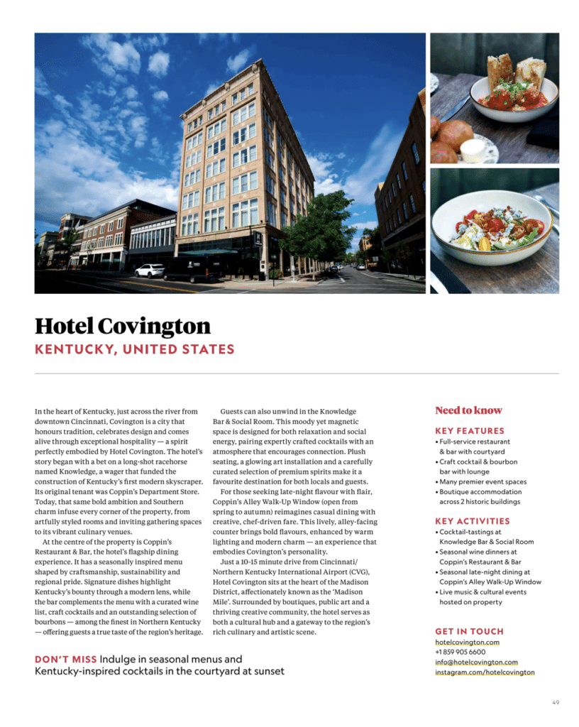 We’re honored to share that Hotel Covington and Coppin’s Restaurant & Bar have been featured in National Geographic Traveller’s Culinary Collection—a global guide celebrating destinations where exceptional food, design, and sense of place come together. From Kentucky-inspired cuisine at Coppin’s to our storied setting in the heart of Covington, it’s an exciting recognition of the experiences we’re proud to share every day.